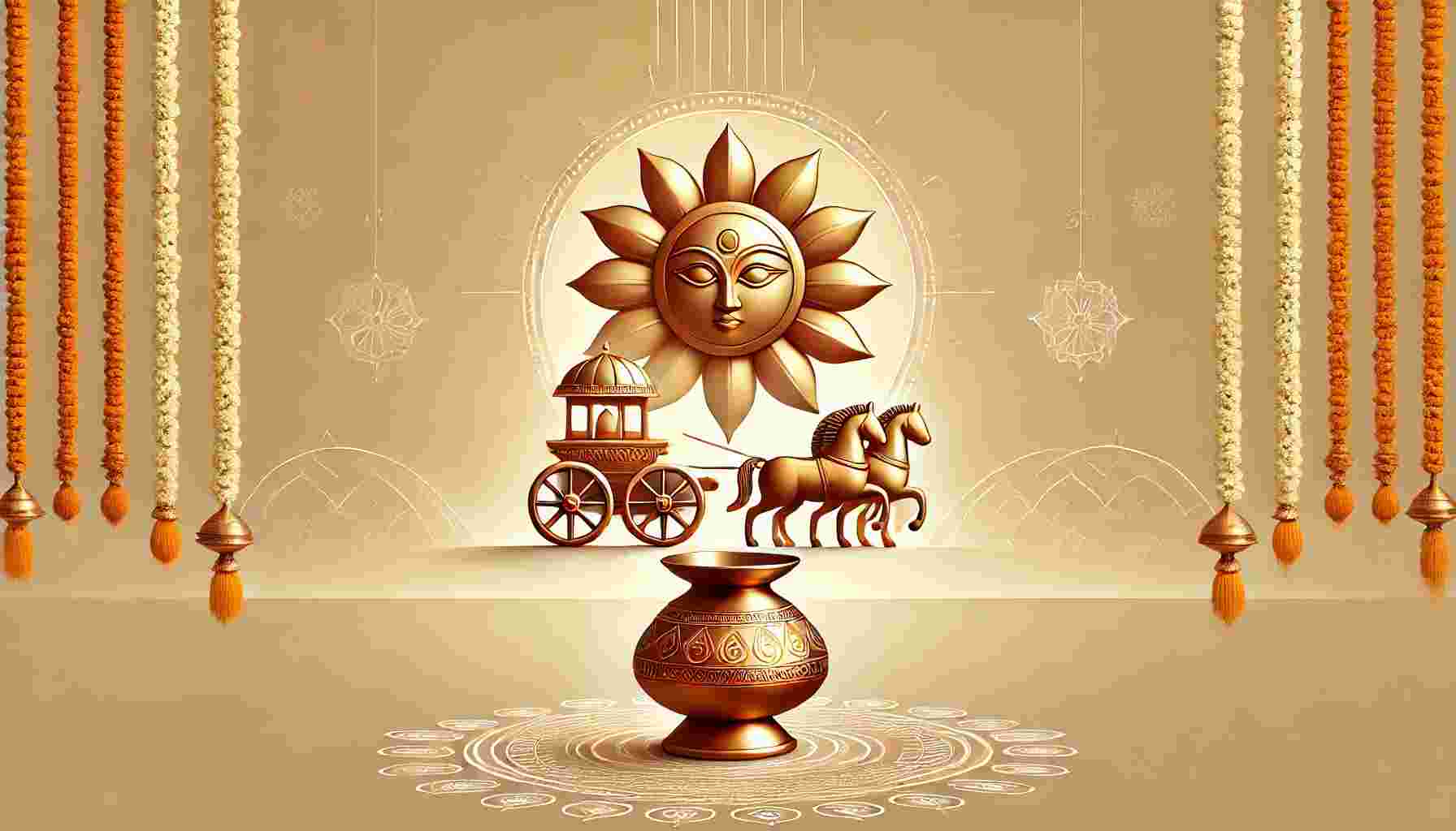 Women create intricate rangolis and draw images of the Sun’s chariot, a representation of Surya’s divine vehicle pulled by seven horses. These designs reflect the festival's essence and are a visual tribute to the Sun God.